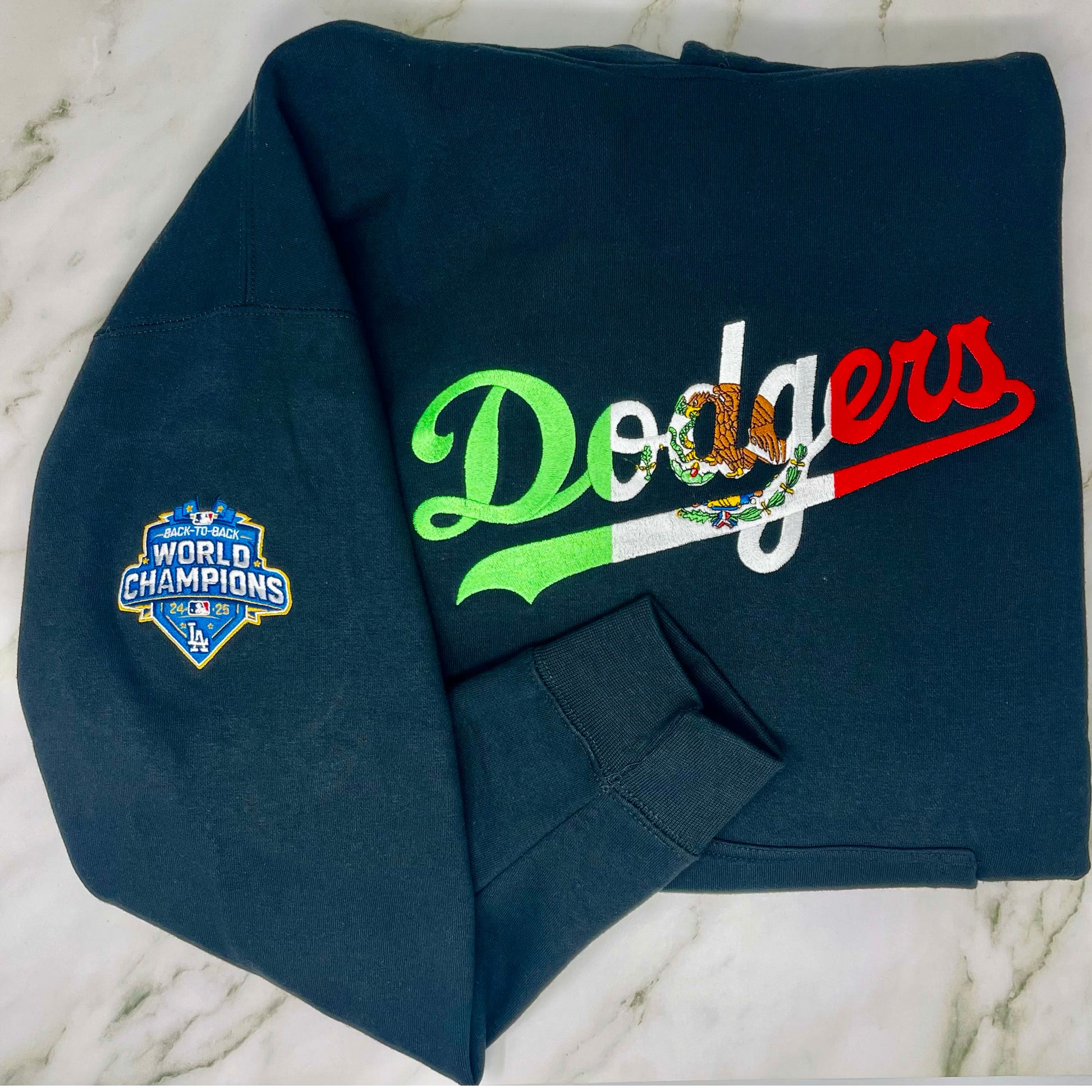Los Angeles Dodgers Embroidered Sweater – Mexican Flag & Back-to-Back Champions Sleeve Baseball Fan Apparel